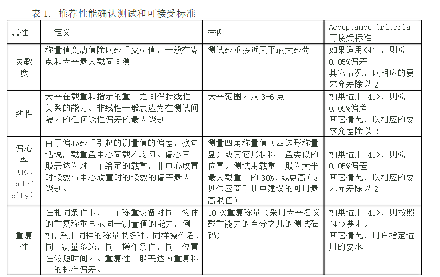 表1提供了一個(gè)天平zui重要屬性的清單,在性能確認(rèn)中應(yīng)該進(jìn)行評(píng)估。根據(jù)應(yīng)用的風(fēng)險(xiǎn)不同,要求的稱重允差不同,有時(shí)該類測(cè)試可以省略。如果有證據(jù)表明該屬性僅對(duì)稱量性能形成很小的影響,則也可以省略對(duì)其進(jìn)行的測(cè)試。任何所用的程序均應(yīng)與公司內(nèi)部,適用于該特定天平的標(biāo)準(zhǔn)操作規(guī)程一致,并應(yīng)進(jìn)行充分判定。性能確認(rèn)應(yīng)按標(biāo)準(zhǔn)操作規(guī)程的描述周期實(shí)施,各測(cè)試的實(shí)施頻率可能根據(jù)屬性的關(guān)鍵程度不同而不同。